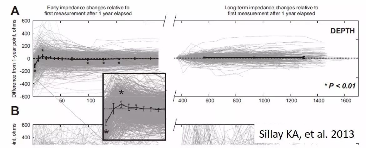 脑深部电极阻抗值的变化(相对于植入1年时)