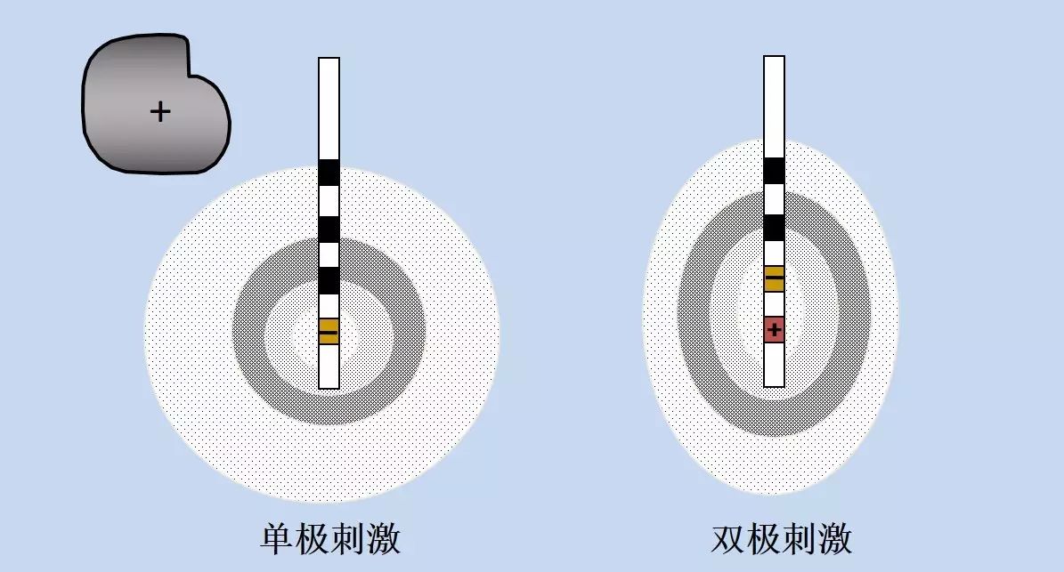 任何电荷周围都会形成电场。DBS 的正极和负极之间也存在电场,我们可以用电力线来表示。不同的触点设置会形成不同形状的电场。例如,触点为负极而刺激器外壳为正极的设置,由于两者距离远,负极触点周围会形成一个类似球型放散的电场。而两个触点分别设置为正极和负极时,两者之间所形成的电场则是椭球形。触点设为负极而刺激器为正极的模式称为单极刺激,而同一根电极上的不同触点分别设为正负极时称为双极刺激。