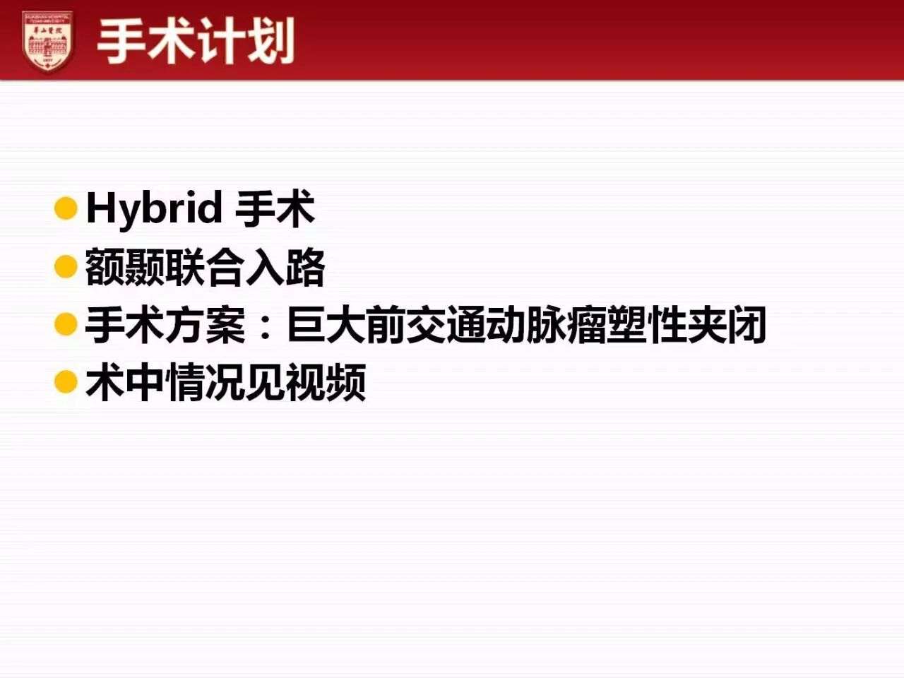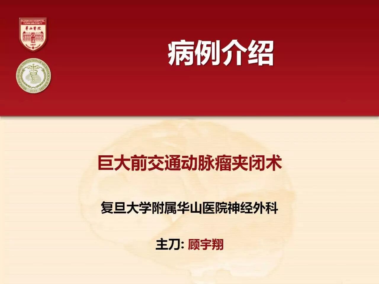 今天为大家分享的是《正海-妙术视界》第六十期,由复旦大学附属华山医院神经外科顾宇翔主任团队带来的:“巨大前交通动脉瘤夹闭1例”精彩手术视频及病例PPT,欢迎观看与分享。