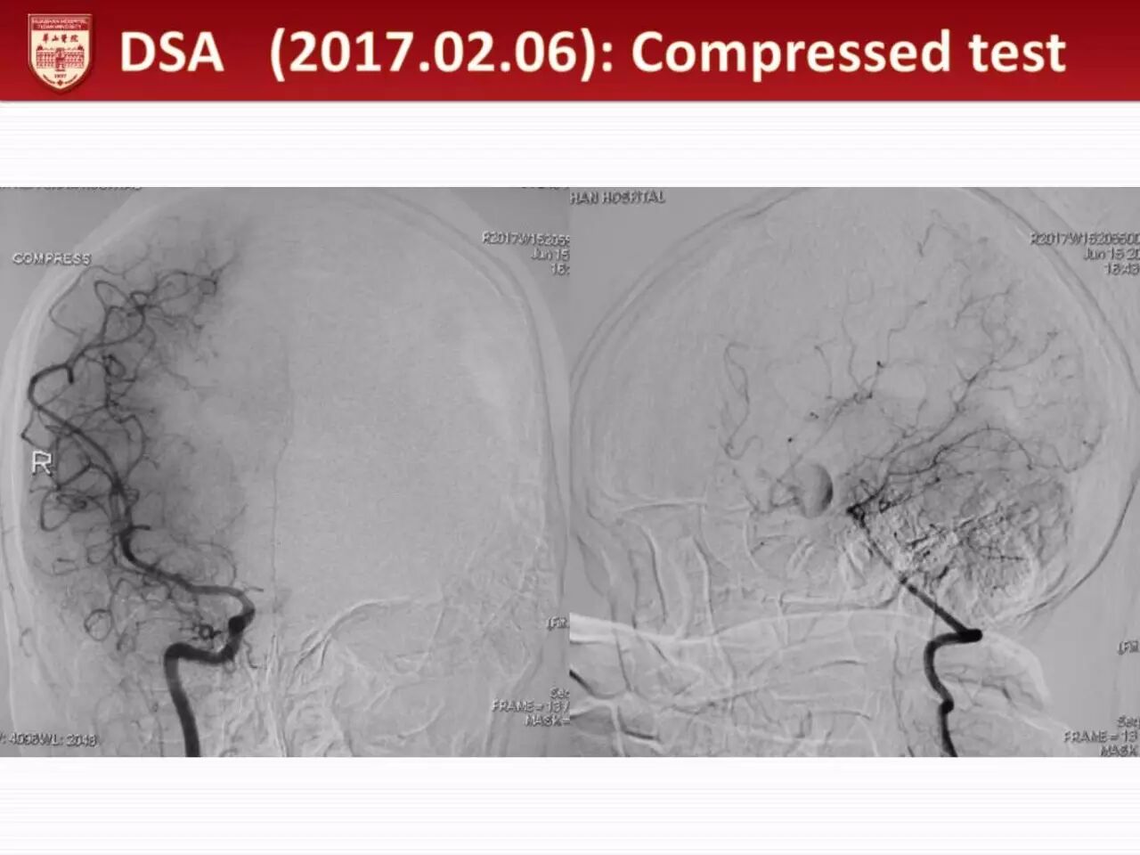 松开临时阻断夹后,动脉瘤未见活动性出血,术中多普勒证实同侧A1、A2、前交通及对侧A2血流通畅。即刻复查全脑血管提示右侧A1狭窄,遂调整动脉瘤夹后再复查造影证实动脉瘤完全夹闭无残留,且右侧A1、A2、前交通及对侧A2通畅。术后患者恢复良好,无神经功能障碍。