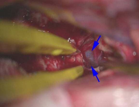 图14. 肿瘤切除后,大脑内静脉(蓝色箭头)可见于瘤腔后方、穹窿开叉处。