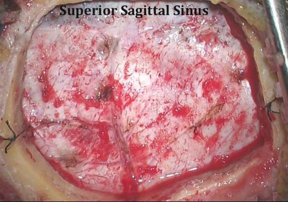图10. 大脑镰缝线牵拉上矢状窦,扩大纵裂入路空间。