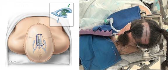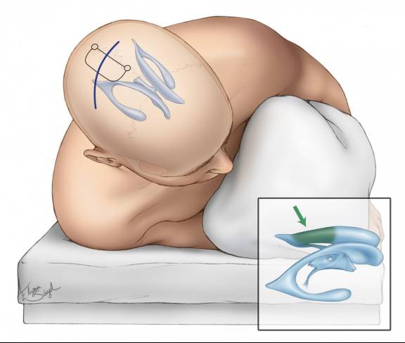 图7. 仰卧(左图,肩垫高)和侧卧(右图)位时,患者头部的旋动范围较大,可使矢状缝与地面平行,颈椎可呈45度抬起,重力作用可使大脑半球自然下沉起牵开作用。