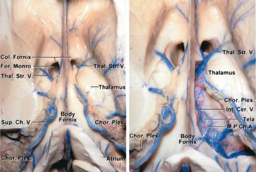 脉络膜结构与肿瘤切除和血供阻断密切相关。脉膜丛粘附于侧脑室内壁的脉络裂。脉络裂为穹窿和丘脑之间的间隔,起源于室间孔附近,沿侧脑室体部、三角区和颞角方向延续。