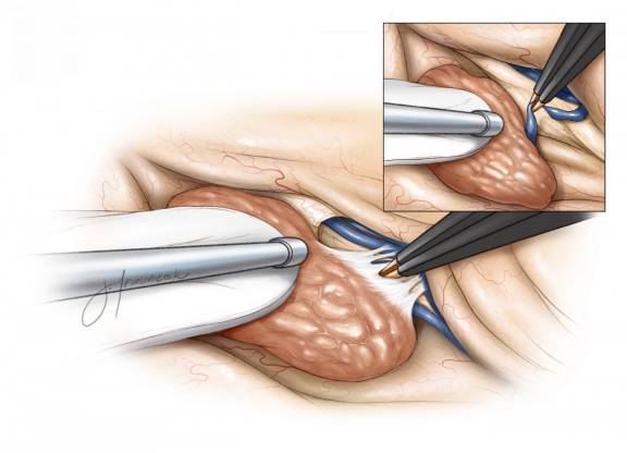 累及静脉和穹窿,是决定肿瘤能否全切的决定性因素。虽然隔静脉并非不可或缺,但丘纹静脉和大脑内静脉对间脑是至关重要的。超声引吸器有助于肿瘤分块切除。减容后的肿瘤过度牵拉可能导致脑室壁意外损伤。