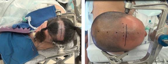图8. 采用发际线后方小冠状切口,横跨或仅位于冠状缝前方。尽管很多术者提倡马蹄形切口,采用仰卧头正中位(左图),但是笔者采用直线切口,仰卧位,头位偏转90度(右图)。该切口的走行设计据肿瘤位置而异;颅骨骨窗的后界不应到达中央前回(距冠状缝后方最多约3至4厘米)。腰大池引流后,纵裂的分离会较容易。