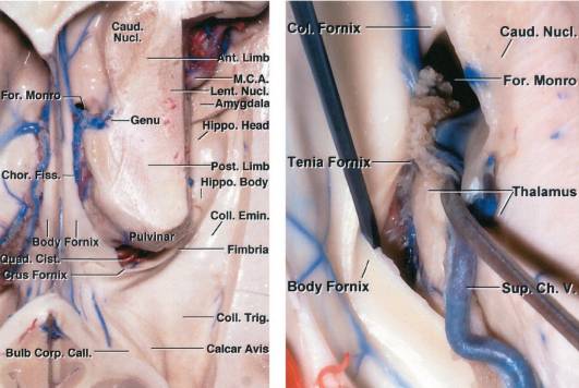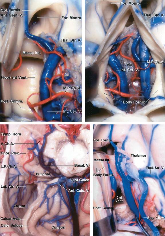 图6. 术中需关注的关键血管解剖,包括:脉络膜前动脉、脉络膜后动脉内侧支(供应脉络丛),尾状核静脉和隔前静脉、脉络膜上静脉、房内/外侧静脉、丘纹静脉、脑室下静脉、脉络膜下静脉以及杏仁体和海马的静脉。主要引流静脉包括大脑内静脉和基底静脉,部分结构是可见的。经侧脑室的脉络裂与穹窿间入路如首行图所示(图片来源:AL Rhoton, Jr教授)。