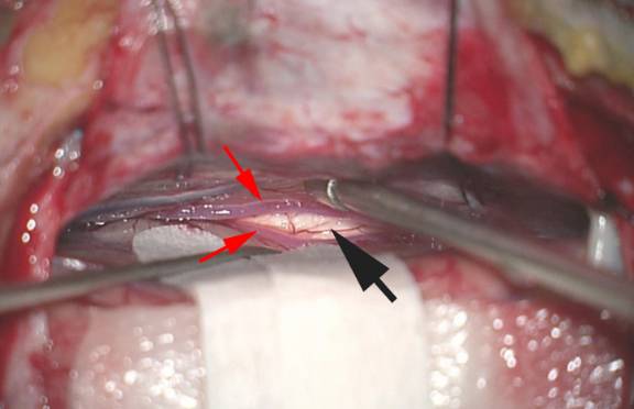 图11. 利用显微外科技术解剖双侧扣带回间的裂隙,充分暴露。需要谨慎避免软膜损伤。注意勿将扣带回误认为胼胝体(黑色箭头)。此时胼周动脉清晰可辨(红色箭头)。注意扣带回间的解剖需充分,大脑半球可以一定程度地向下游离,创造空间。