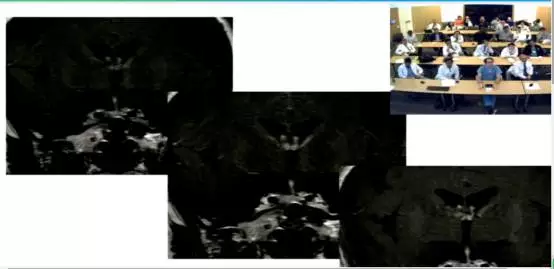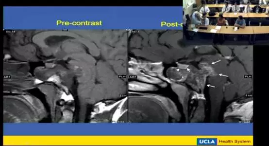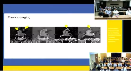 首先由UCLA Ooi医师汇报了一例广泛破坏斜坡并突入桥脑的脊索瘤病例,采取神经内镜下经鼻蝶入路全切肿瘤,神经功能保护良好。双方就如何进行鞍底重建、保护桥脑功能及术后放疗问题进行了讨论。