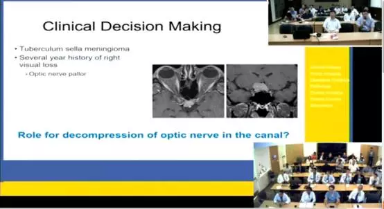 UCLA的第二个病例是一例侵犯视神经管伴右眼失明的鞍结节脑膜瘤患者。经过一期神经内镜下经鼻蝶视神经管减压、视交叉下肿瘤切除后,右眼视力好转,二期眉弓锁孔入路全切视交叉上方残余肿瘤。此类患者如何最大限度保护视力是临床面临的难点。双方就手术指证、手术方式及手术技巧分享了各自的经验。
