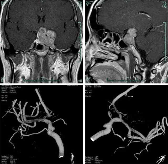 浙医二院的第二个病例是由闫伟副主任医师汇报的复发侵袭性垂体瘤合并双侧颈内动脉海绵窦段镜像动脉瘤。该患者治疗极具挑战性,因肿瘤侵犯海绵窦,并包绕后交通动脉;更为罕见的是肿瘤紧临双侧颈内动脉动脉瘤。该患者因肿瘤压迫造成视力减退,且为无功能性腺瘤,因此手术为首选方案。