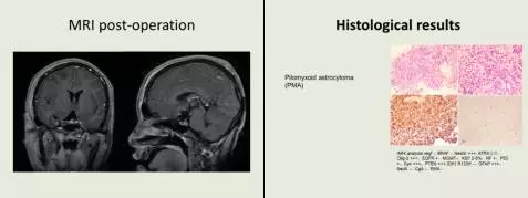 第六个病例是由来自浙医二院的闫伟副主任医师介绍的一例罕见的鞍上毛细胞黏液样星形细胞瘤。由于患者年仅20岁,肿瘤切除后的后续治疗如何在减少肿瘤复发与预防并发症间取得平衡,是本例讨论的焦点。UCLA的Linda Liao教授是世界著名的脑肿瘤专家,综合患者的各项信息,她建议继续密切复查,这一提议也得到了我方的认同。