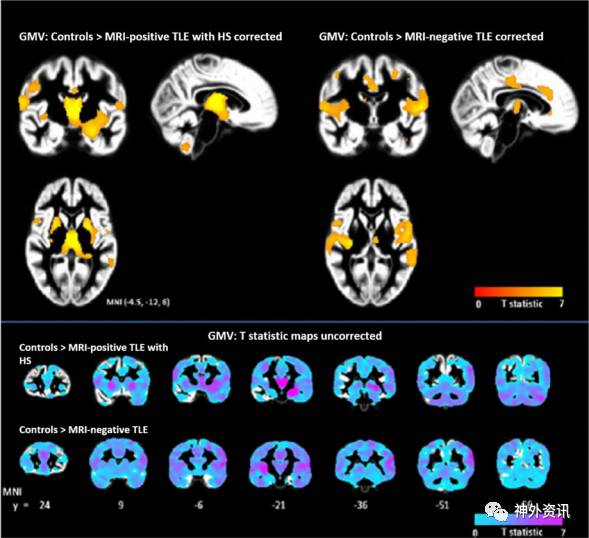 图1. HS+MTLE(左)和MRI阴性TLE(右)患者的脑灰质体积(GMV)减小。