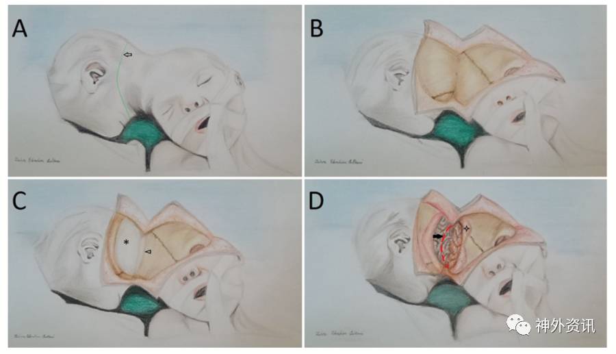 图4. 手术操作示意图。A.为皮肤切口位置;B.为去除皮瓣后的颅骨,见两骨间纤维连接;C.为打开颅骨,箭头代表活婴侧的边界,星代表硬膜;D.为打开硬膜(星)和切开脑组织部位(箭头)。手术从死婴脑组织切开,保证活婴脑组织的完整性。