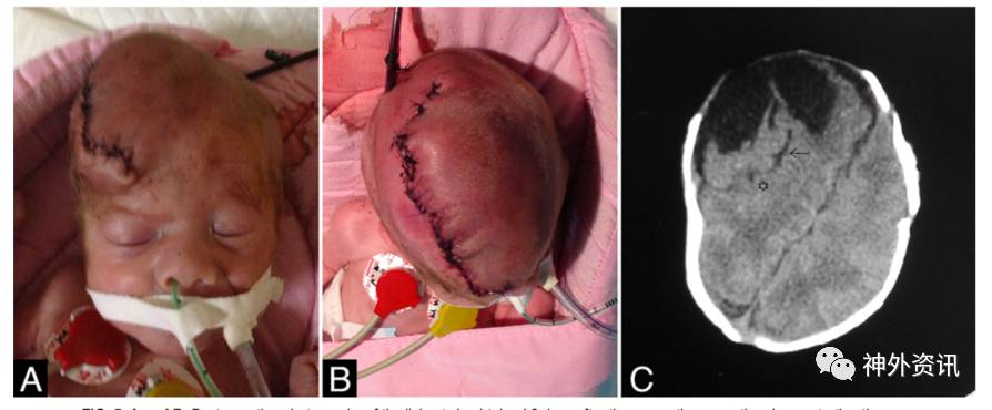 图5. A和B为术后第2天活婴照片,C为术后2周的CT图像,可见活婴脑内残留有死婴的脑组织,它们之间一部分有明确的界限(箭头),一部分已相融合(星)。