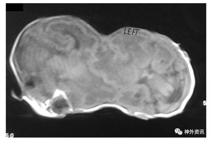 图2. MRI-T1加权像示,左侧婴儿脑结构相对正常,右侧婴儿脑室轻度扩大伴结构异常;两脑间结构有交叉。