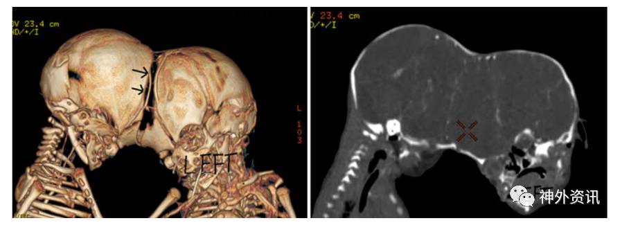 图3. 左图为CT成像的3D重建,见两颅骨间存有类似纤维连接(箭头);右图为CT增强片示两个婴儿的脑间有共同的静脉和动脉分支;提示左侧婴儿的大脑中动脉和右侧婴儿的大脑中动脉可能相吻合。