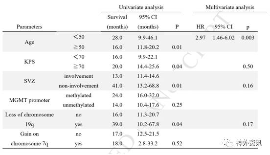 随访结果显示,96例患者平均随访时间与生存期分别为13与16个月,其中50例(68%)为STS, 17例(24%)为mLTS(包括 LTS),7例(10%)为LTS。统计学分析显示,与STS者相比,<50岁的低龄、较优良的RPA等级、肿瘤未侵入室管膜下区(SVZ)、MGMT基因甲基化以及19q丢失与mLTS者相关。校正相关因素后发现,低龄与MGMT甲基化与mLTS独立相关。与STS者相比,低龄、较优良的RPA等级、肿瘤未侵入SVZ以及19q丢失与LTS者相关。校正相关因素后发现,低龄以及较优良的围手术期KPS评分与LTS者独立相关。Kaplan–Meier分析揭示,低龄、较优良的围手术期KPS分数(≥70)、肿瘤未侵入SVZ以及19q丢失与总生存期(OS)较长相关。多变量分析结果显示,仅年龄与OS相关(图1、表1)。