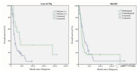 图1. Kaplan–Meier分析胶质母细胞瘤患者预后因素。左图19q缺失;右图MGMT启动子甲基化。