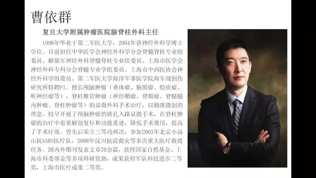 曹依群,复旦大学附属肿瘤医院脑脊柱外科主任。1998年毕业于第二军医大学,2004年获神经外科学博士学位。目前担任中华医学会神经外科学分会脊髓脊柱专业组委员、解放军神经外科脊髓脊柱专业组委员、上海市医学会神经外科专科分会脊髓专业学组委员、上海市中西医协会神经外科学组委员、第二军医大学海洋军事医学院海军战创伤研究所特聘PI。擅长颅脑肿瘤(垂体瘤、脑膜瘤、胶质瘤、听神经瘤等),脊柱椎管肿瘤(神经鞘瘤、脊膜瘤、脊髓髓内肿瘤、脊柱肿瘤等)的显微外科手术治疗,以精准微创的理念,较早开展了颅脑肿瘤的锁孔入路显微手术,在脊柱肿瘤的治疗中着重解剖复位和功能重建,降低手术费用,提高了手术疗效。