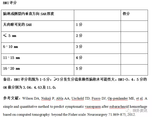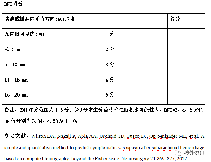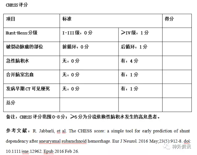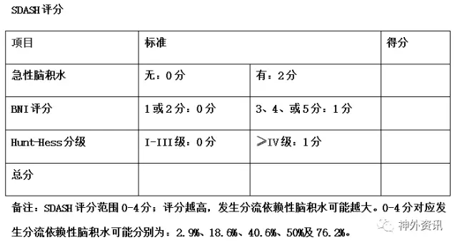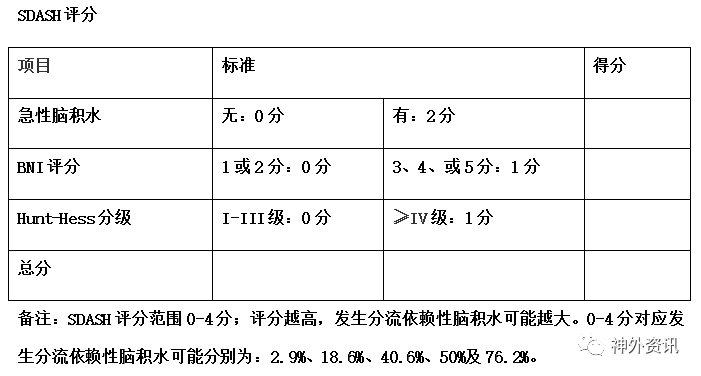 该研究从314例aSAH患者的数据资料中,比较CHESS评分与BNI评分的结果。根据多变量分析选出的独立危险因子,设计新的简易评分系统—aSAH患者分流依赖评分(shunt dependency in aSAH score,SDASH)。