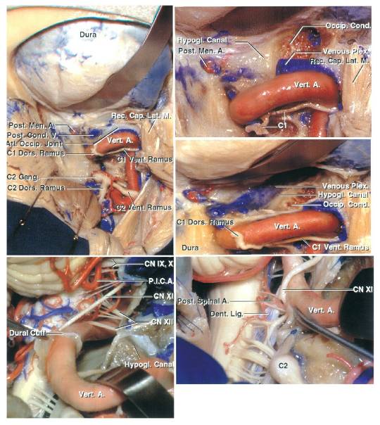 图5. 这些图片进一步展示颅颈交界区复杂的血管神经解剖关系。上图揭示完整的枕髁切除后右侧舌下神经的相关解剖。注意椎动脉的肌支及其定位(下图);肌支的撕脱会导致喷射性出血,但是这样的出血不应与主干出血相混淆。C1神经根和副神经的上1-2个脊神经根在显露大肿瘤时可能会牺牲(图片感谢Rhoton教授授权)。
