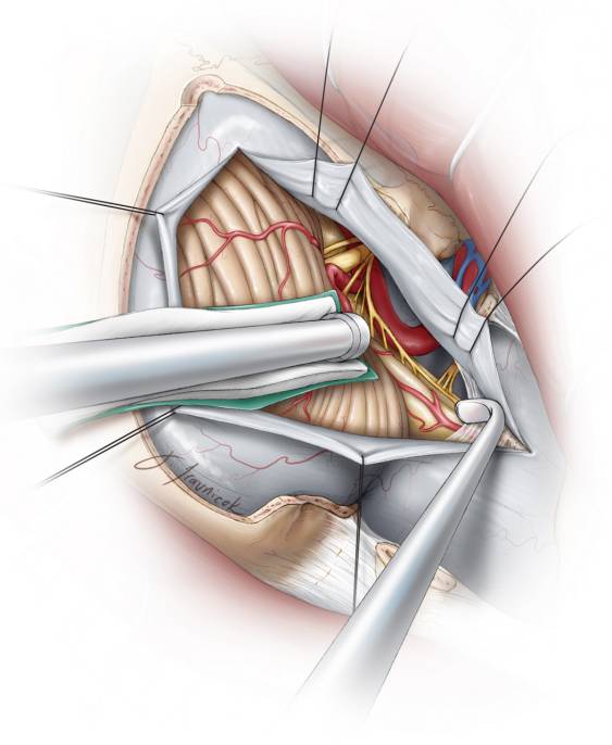 硬膜边缘用4-0缝线牵拉,并且术中应保持湿润,避免因显微镜灯光的高热而脱水;这有利于术后不透水缝合。缝线牵拉的针脚应沿骨缘分布(显露硬膜的最前方)来保证硬膜瓣最大程度远离手术视角。这一操作在椎动脉入硬膜处将其向外侧移位并远离术者的工作角度。