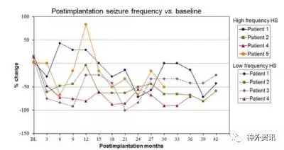 图1. DBS术后5例患者随访期间的癫痫发生情况。