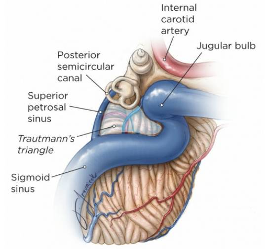 图3. 右侧Trautmann三角(虚线范围)位置及与周围结构关系。经岩骨后入路显露过程中需首先磨除此区域骨质。