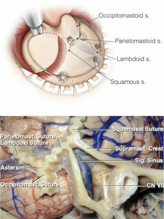 使用铣刀行颞下及枕下乙状窦后开颅。由于硬膜窦常与颅骨内面紧密附着,因此在硬膜窦处避免使用铣刀。下图主要显示此区域骨缝相关解剖。(图片由AL Rhoton, Jr提供)