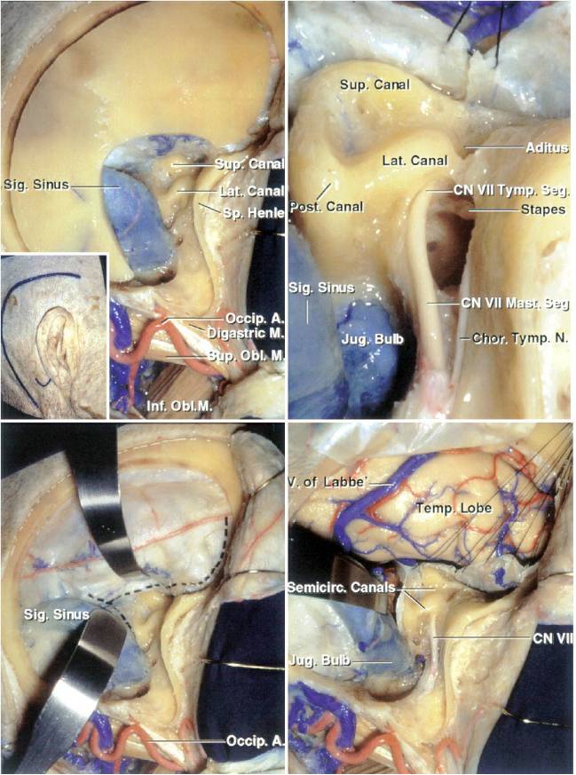 右上图示颞骨相关解剖结构。面神经鼓室段走形于外半规管的下方。左下图示显露出硬脑膜。右下图示剪开硬脑膜并保护Labbé静脉。