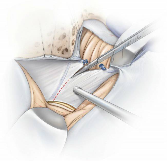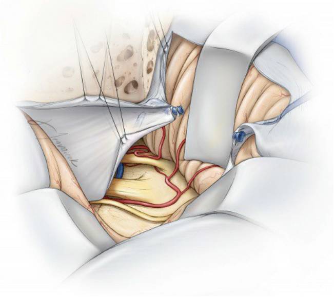 图17. 接下来使用牵开器抬起颞叶及后份小脑幕瓣,另一牵开器向下牵开小脑。悬吊乙状窦前硬膜、颞侧硬膜及小脑幕。为使显露区域最大化,悬吊时缝线位置尽可能深及骨缘。