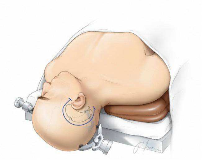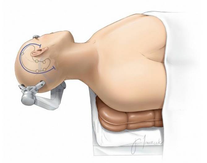 患者取仰卧位,上半身稍抬高以利于静脉回流。同侧肩下垫肩垫,头部偏向对侧,矢状缝大致平行于地面。