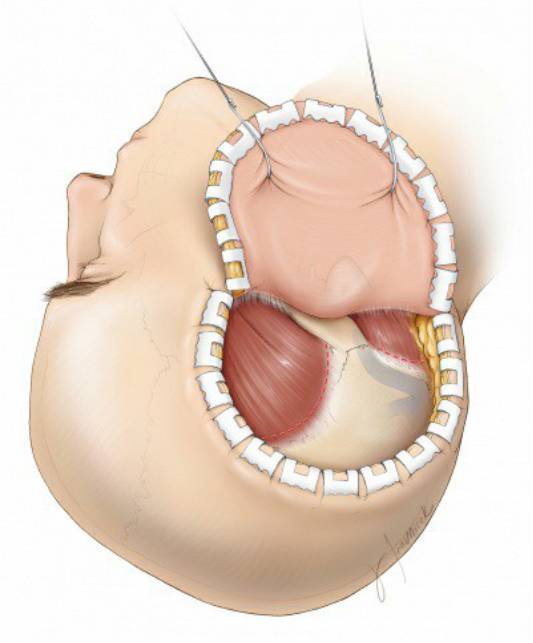 另外,暴露操作时取下的带血管蒂的骨膜瓣可用于封堵硬膜缺损。钛钉钛板复位固定骨瓣,后续步骤按常规关颅。