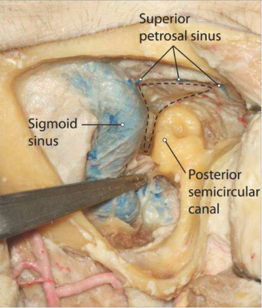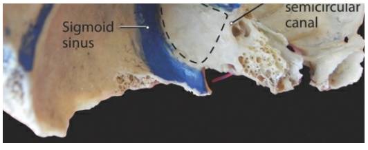 与横窦不同,乙状窦一般嵌入颅骨内。因此骨质磨除时更需小心谨慎以保护乙状窦。必要情况下可保留乙状窦表面的薄层骨质以最大化保护此结构。