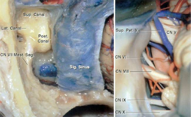 图4. 左侧经岩骨后入路或乙状窦前入路骨质磨除过程中硬膜外(左图)及硬膜下(右图)显露的结构。(图片由AL Rhoton,Jr提供)