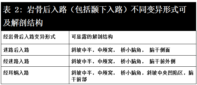 累及上述区域以上的岩斜区病变更适合采用经岩前入路。而颈静脉结节水平以下的病变采用扩大的乙状窦后入路较容易到达。
