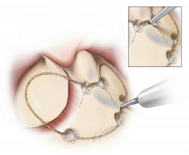 图8. 笔者使用切削钻“蛋壳技术”磨除钻孔之间硬膜窦表面的骨质,之后使用咬骨钳缓慢分离窦壁与颅骨内板,将剩余骨质咬除。