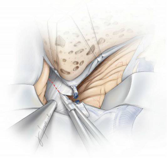 图13. 沿颞窝底向后至岩上窦水平做第二段硬膜切开。为避免Labbé静脉的损伤,笔者稍剪开硬膜,向硬膜下探查此静脉汇入横窦或岩上窦的位置。