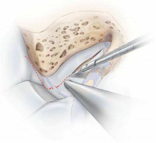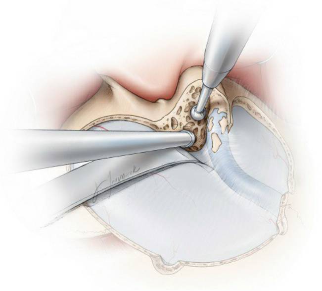 若骨迷路及膜迷路同时破坏,必须使用小块骨蜡修补缺损处。此种情况下有极高的风险不仅会造成失聪而且会导致眩晕。需要轮廓化迷路的扩大迷路后入路相关内容请参见《扩大经岩骨后入路》。