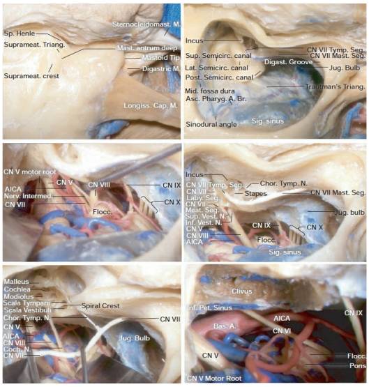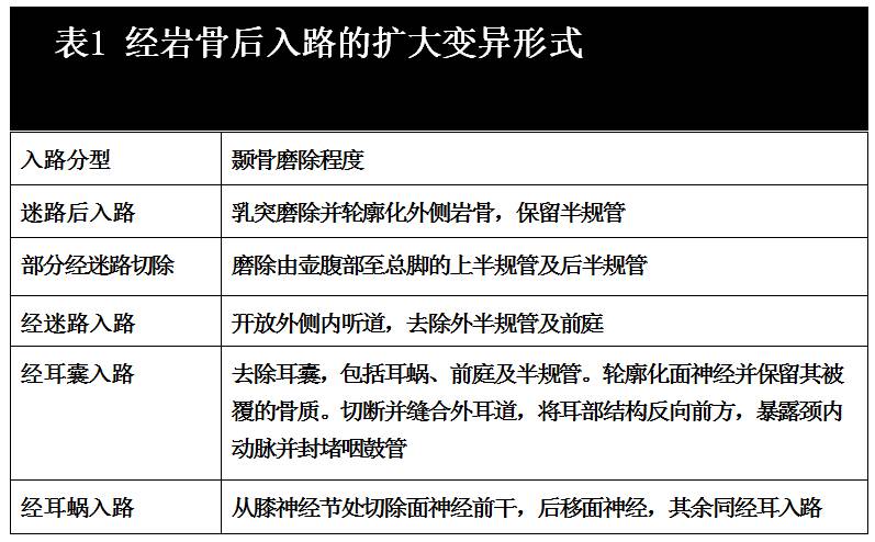根据颞骨的磨除程度,经岩骨后入路有多种变异形式。逐步磨除颞骨可扩大腹侧手术暴露区域,同时会增加颅神经特别是CN.VII及CN. VIII损伤的风险。