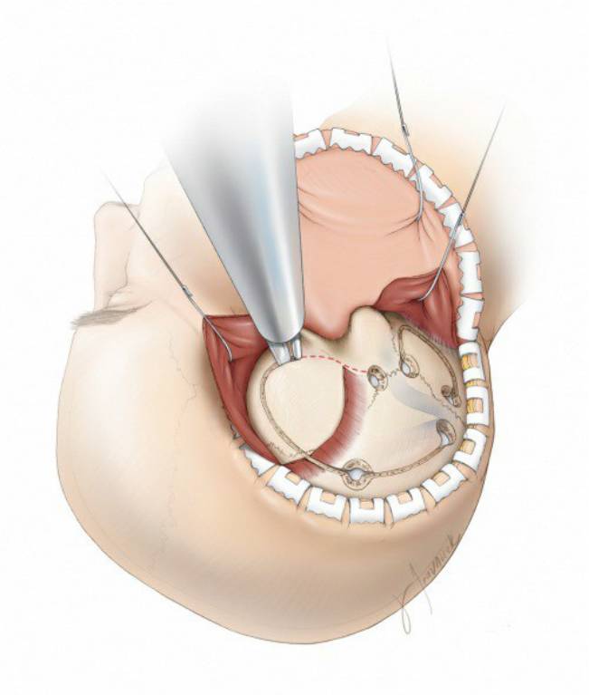 将颞肌自颅骨分离并翻向前下方。分离附着在乳突及上项线上的肌肉,显露枕下颅骨。