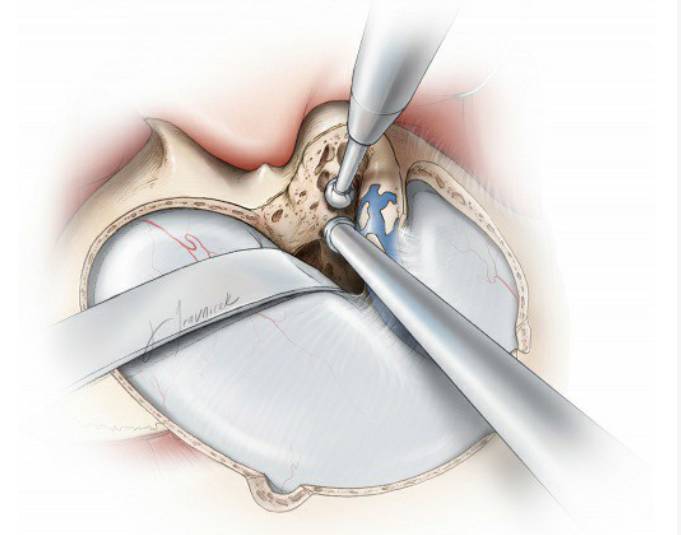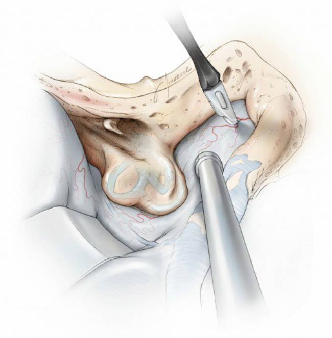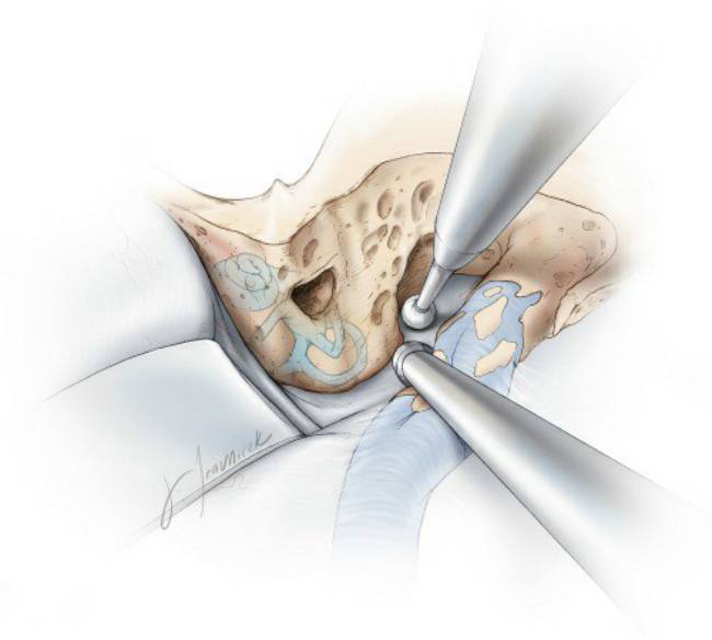 迷路后入路手术中需要注意保留患者听力,不可伤及骨迷路。若不慎破坏迷路骨质,而膜迷路保留完整,可用少量骨蜡或筋膜覆盖缺损处。若骨迷路及膜迷路同时破坏,必须使用小块肌肉修补缺损处防止周围及内淋巴液漏出。此种情况下有极高的风险不仅会造成失聪而且会导致眩晕。