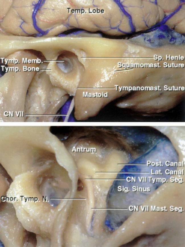 图1. 图示左侧颞骨乳突部的结构细节。乳突房部的显露及外耳道的位置。外耳道后上缘的Henle外耳道上嵴为鼓索及外侧半规管等深部结构的浅表标志(上图)。进一步地磨除乳突骨质后可见后外半规管及鼓索和面神经乳突段。在扩大岩后入路中需要磨除上述骨质(下图)。无需完全轮廓化面神经(译者注:轮廓化-以金刚砂磨钻尽可能薄的磨除神经及血管表面的骨质)(图片由AL Rhoton, Jr提供)。
