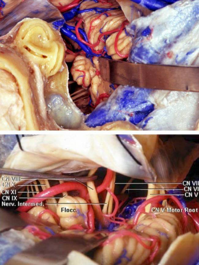 图3. 剪开硬脑膜并将乙状窦轻微牵开后可见至桥小脑角区的手术入路(上图)。放大图示相关颅神经。(图片由AL Rhoton, Jr提供)