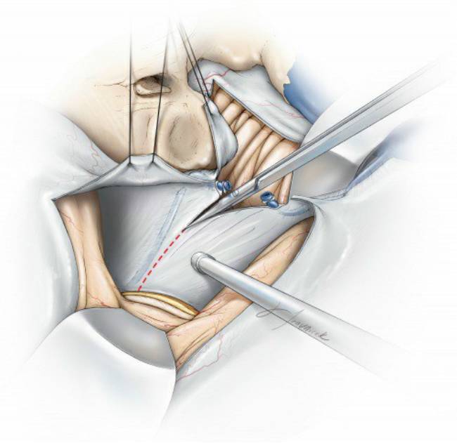 图9. 离断岩上窦后,平行于岩尖边缘朝向小脑幕切迹继续剪开硬膜。如果剪开硬膜的位置过于靠后则会形成小脑幕幕瓣阻碍手术通道。此步操作需要注意牵开器及硬膜悬吊线的位置。