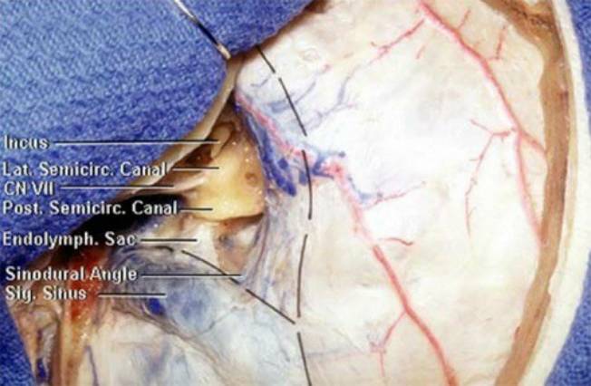 图2. 轮廓化左侧半规管扩大了乙状窦前间隙。剪开硬脑膜时需注意上述标志。在乙状窦前剪开硬脑膜时需避免损伤内淋巴囊。(图片由AL Rhoton, Jr提供)