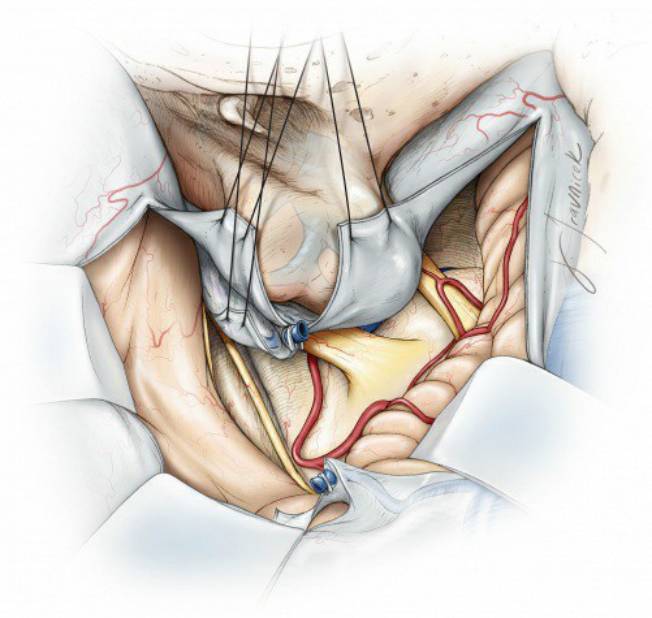 图12. 轻微后拉乙状窦,可见脑干腹外侧及岩斜区的颅神经根。