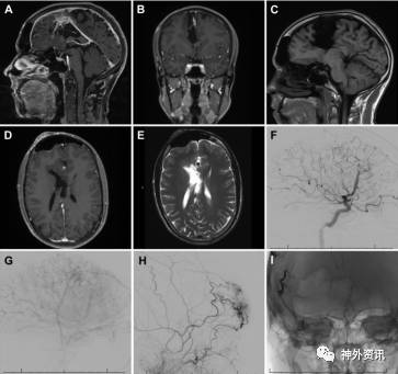 图1. 影像学检查提示右额头皮sAVM伴颅内血管异常。