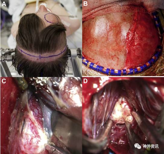 图2. sAVM术中照片。A.做头皮冠状切口和额骨瓣开颅;B.右额叶sAVM处作带血管蒂皮瓣用于保护头皮完整;C.纵裂入路显示,大脑镰旁AVM已切除;D.切除颅内AVM后,电凝大脑镰;采用纱布和纤维蛋白胶包裹ACA远端动脉瘤。